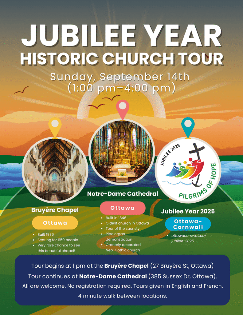 Mark your calendars for the 5th and final Jubilee Year Historic Church Tour! On Sunday, September 14th, starting at 1 PM, we will discover the Bruyère Chapel (27 Bruyère St, Ottawa) followed by Notre-Dame Cathedral Basilica (385 Sussex Dr, Ottawa). The Bruyère Chapel was built in 1936 for the the Sisters of Charity of Ottawa, […]
