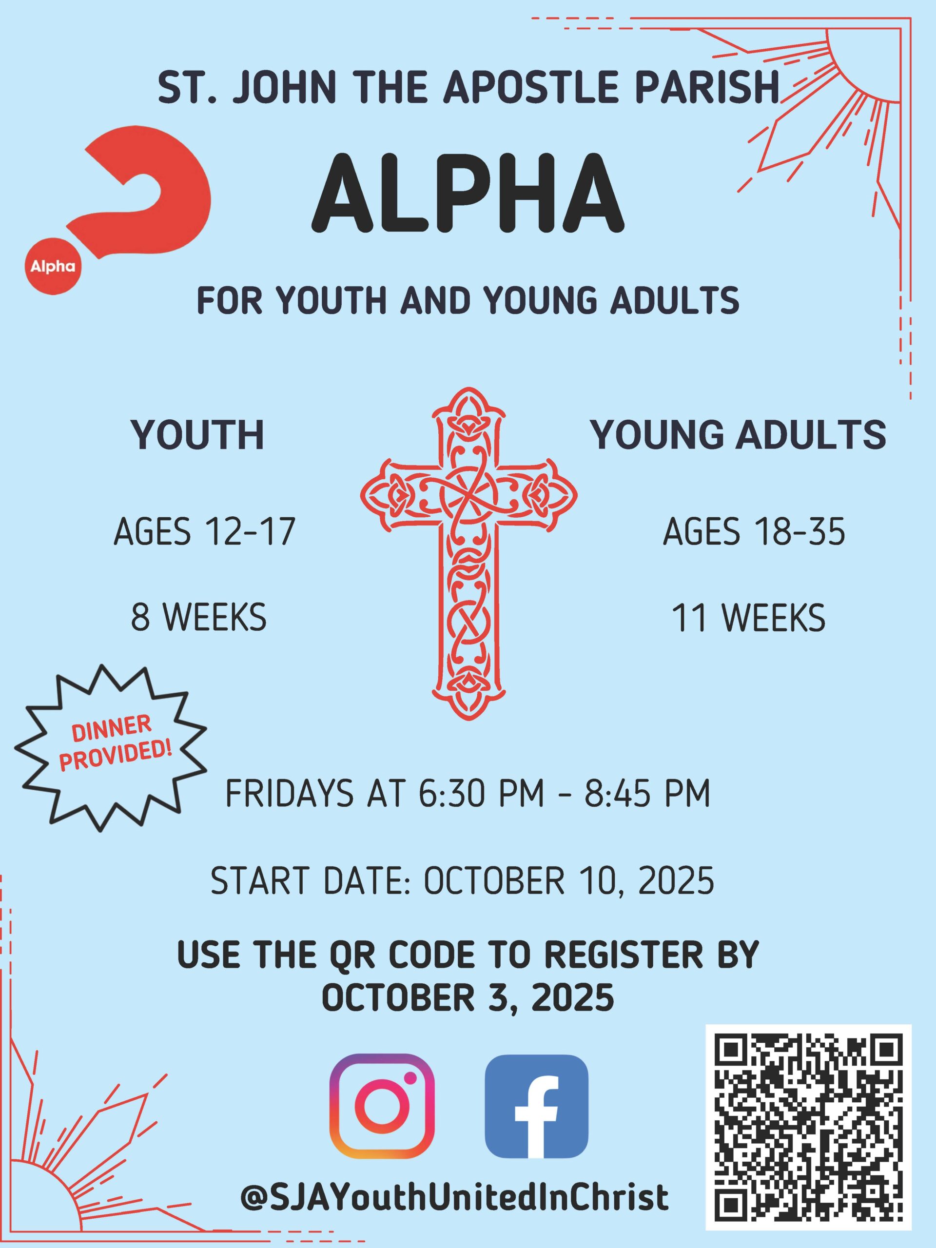 St. John the Apostle Parish Youth Group is pleased to host ALPHA for Youth (8 weeks) and Young Adults (11 weeks).