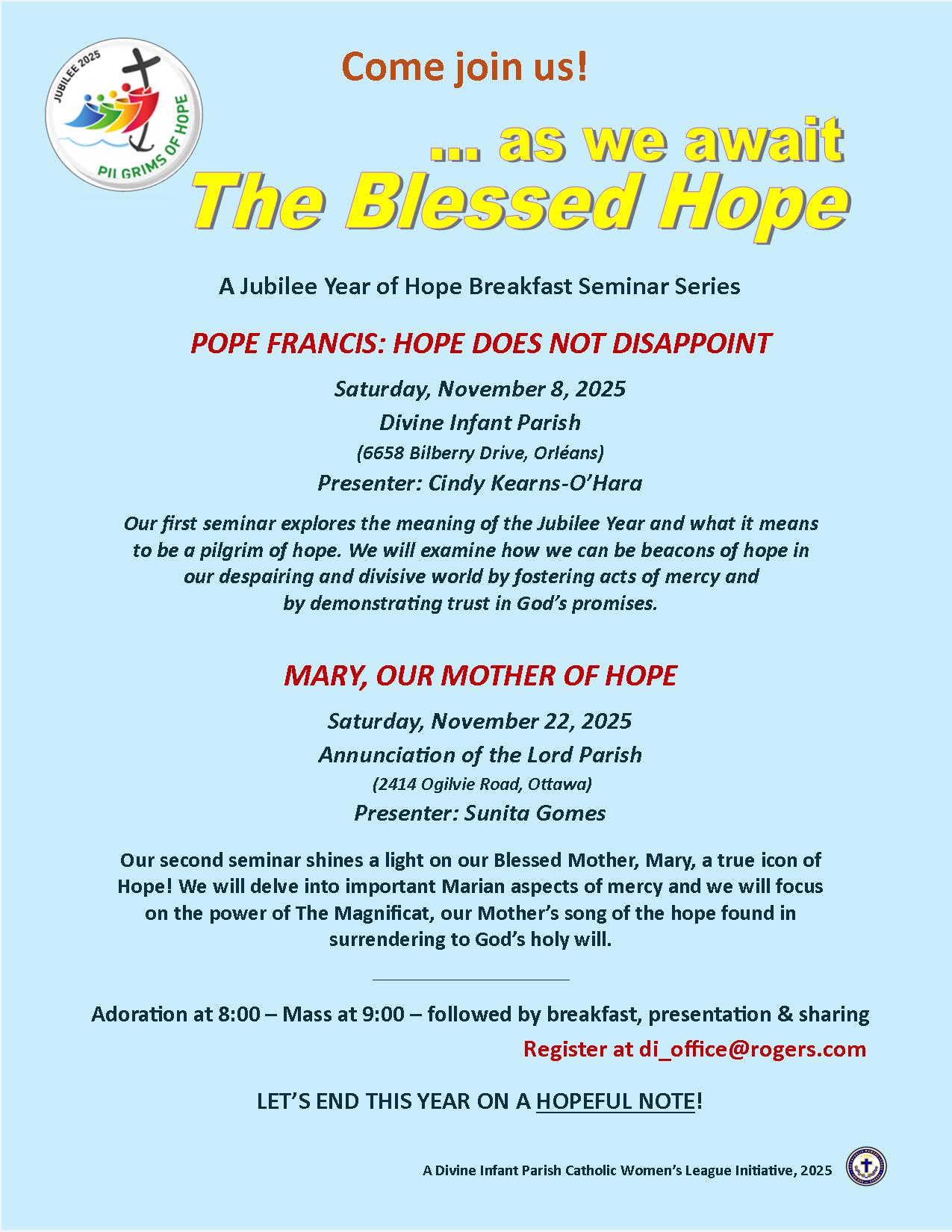 The CWL Council of Divine Infant Parish is hosting a seminar series titled, “…as we await The Blessed Hope”. The first seminar, “Pope Francis: Hope Does Not Disappoint”, will be held on Saturday, November 8th at Divine Infant Parish (6658 Bilberry Drive). It explores the meaning of the Jubilee Year and what it means to be a pilgrim of hope. We will examine how we can be beacons of hope in our despairing and divisive world by fostering acts of mercy and by demonstrating trust in God’s promises.