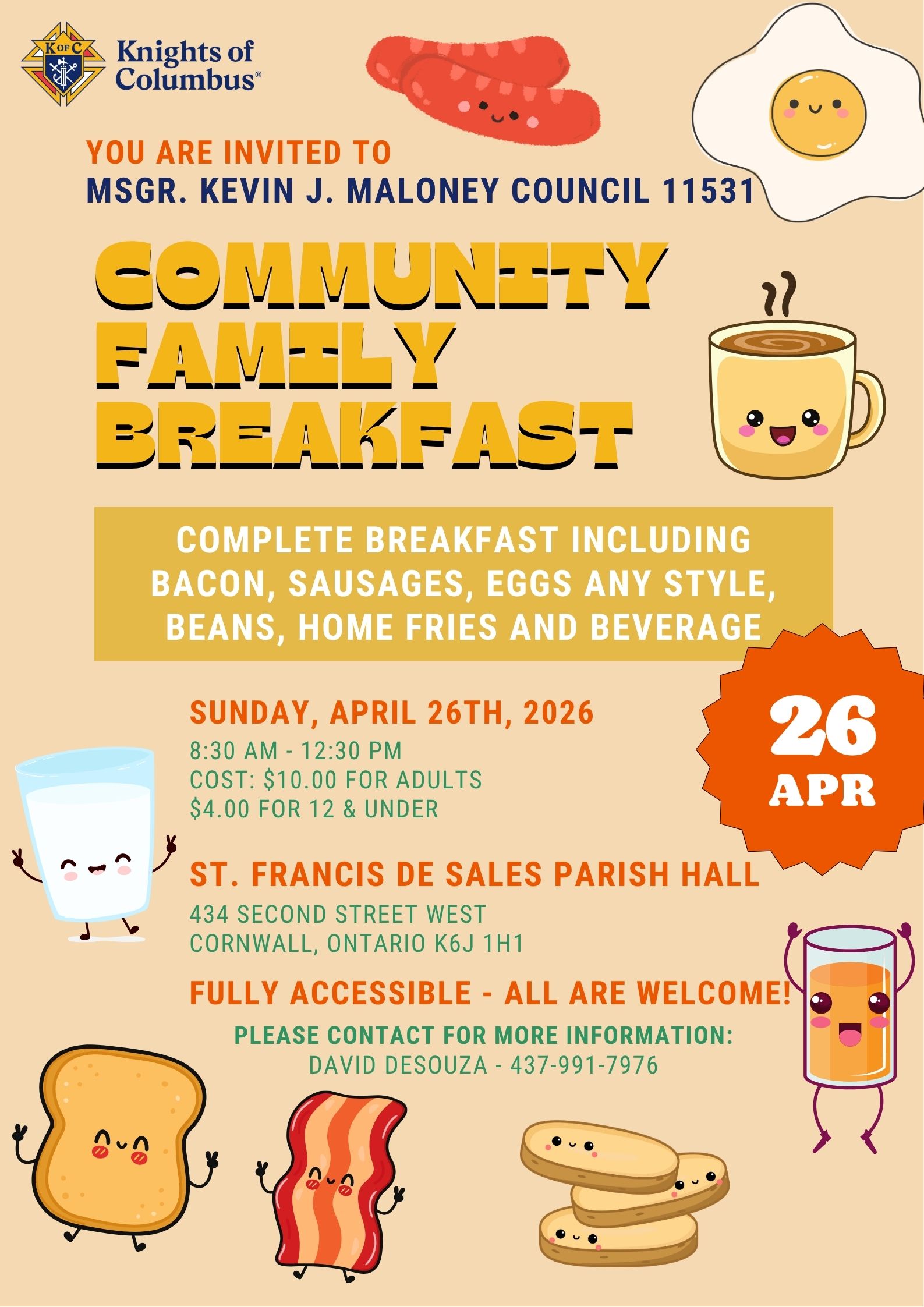 Msgr. Kevin J. Maloney Knights of Columbus Council are back to serving their next delicious Community Family Breakfast on Sunday, April 26th in the St. Francis de Sales Parish Hall (434 Second St. W.) from 8:30 AM to 12:30 PM. Complete breakfast including bacon, sausages, eggs any style, beans, home fries and beverage. All are welcome. Fully accessible venue with elevator service provided.