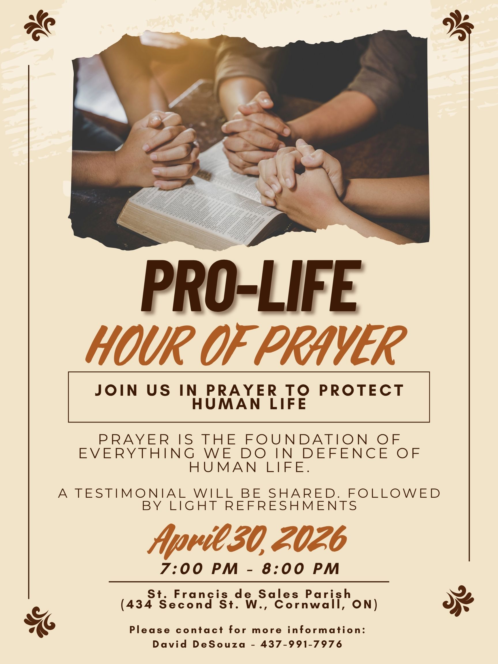 Join us in prayer to protect human life on Thursday, April 30th, 2026 in the St. Francis de Sales Parish (434 Second St. W.), Cornwall, starting from 7pm. We will have a testimonial shared. There will be light refreshments and snacks served in the Parish Hall. Prayer is the foundation of everything we do in defence of human life.