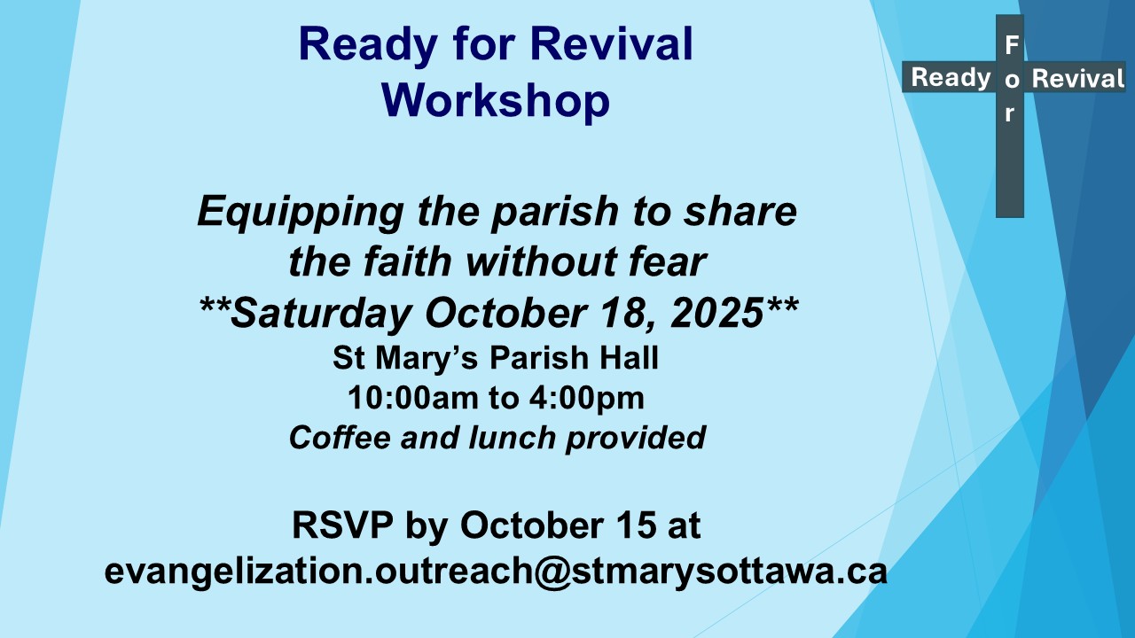 This workshop is intended to help participants share their faith without fear. RSVP by Oct. 15 to evangelization.outreach@stmarysottawa.ca