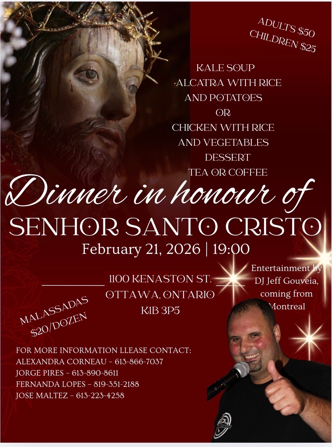 This sit-down dinner is in honor of Senhor Santo Cristo. It includes a choice of beef or chicken with potatoes and vegetables, desert, tea and coffee. The cost for adults is $50 and for children $25.