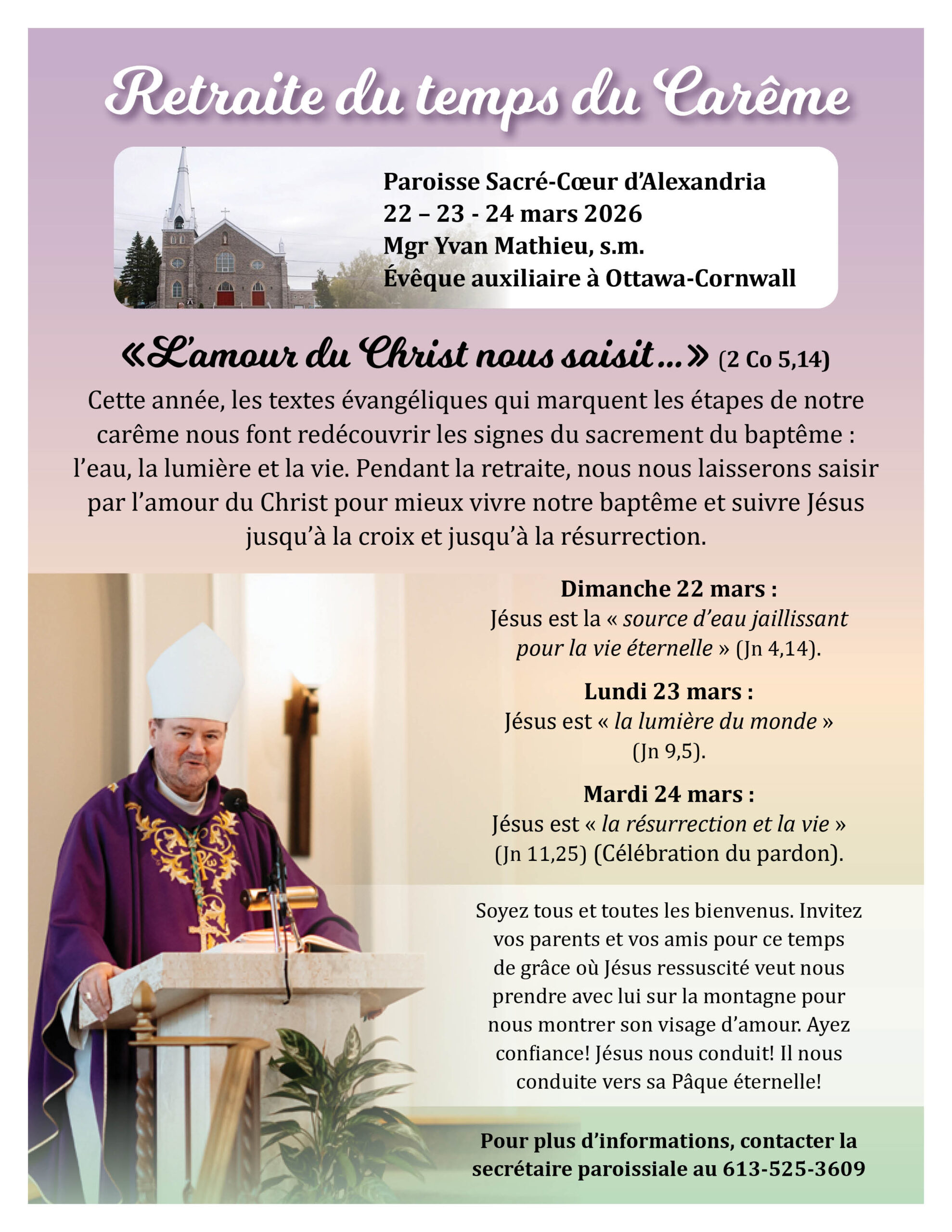 Sous le thème « L’amour du Christ nous saisit… », Notre évêque auxiliaire et V.G, Mgr Yvan Mathieu, s.m., animera la retraite du Carême, les 22, 23 et 24 mars à 19 h, à l’église Sacré-Cœur d’Alexandria.
