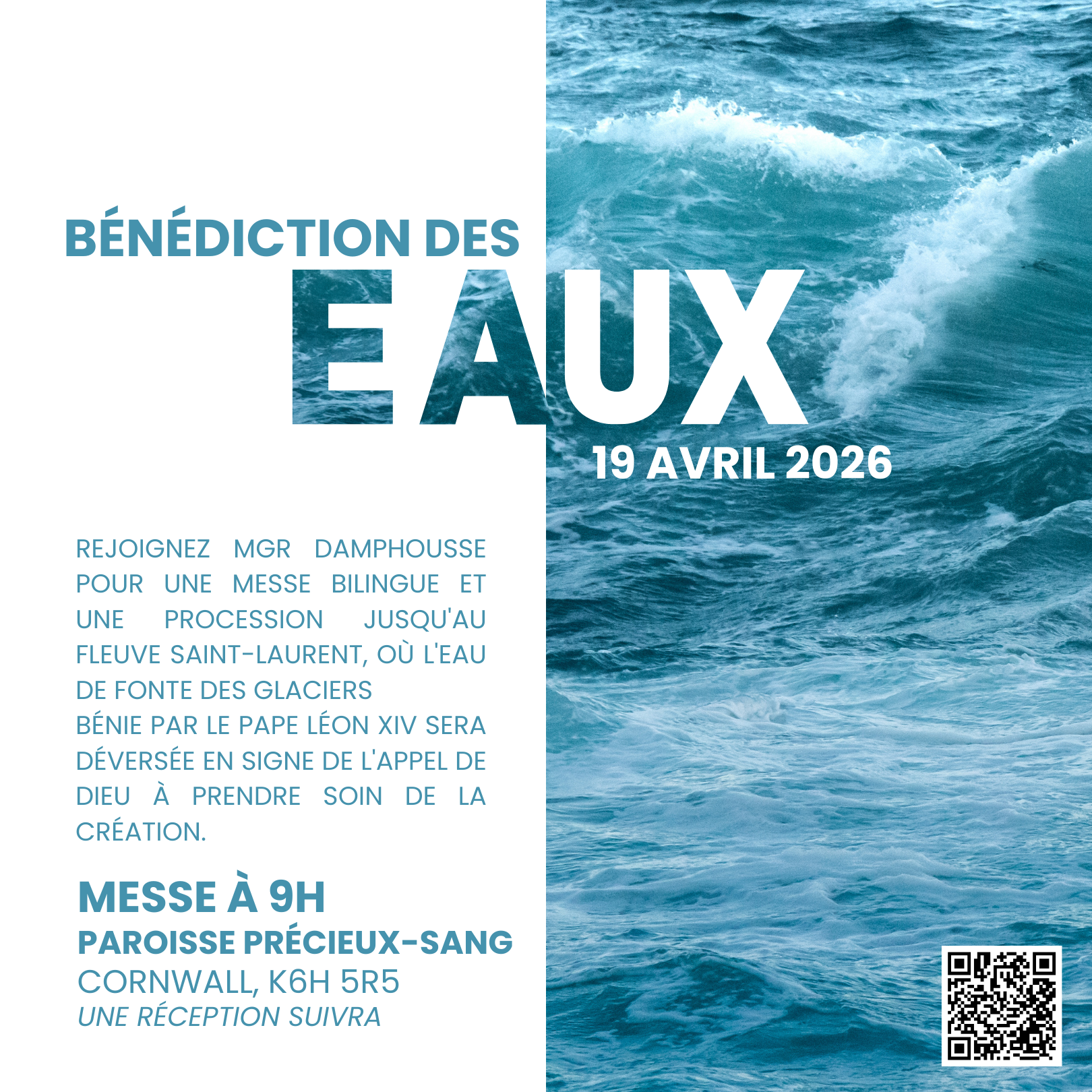 Le 19 avril, rejoignez Mgr Damphousse pour une messe bilingue à 9 h à la paroisse Precious Blood à Cornwall, suivie d’une procession jusqu’au fleuve Saint-Laurent, où l’eau de fonte des glaciers, bénie par le pape Léon XIV lors de la récente conférence « Susciter l’espérance pour la justice climatique » à Rome, sera déversée en signe de l’appel de Dieu à prendre soin de la création. Une réception suivra.