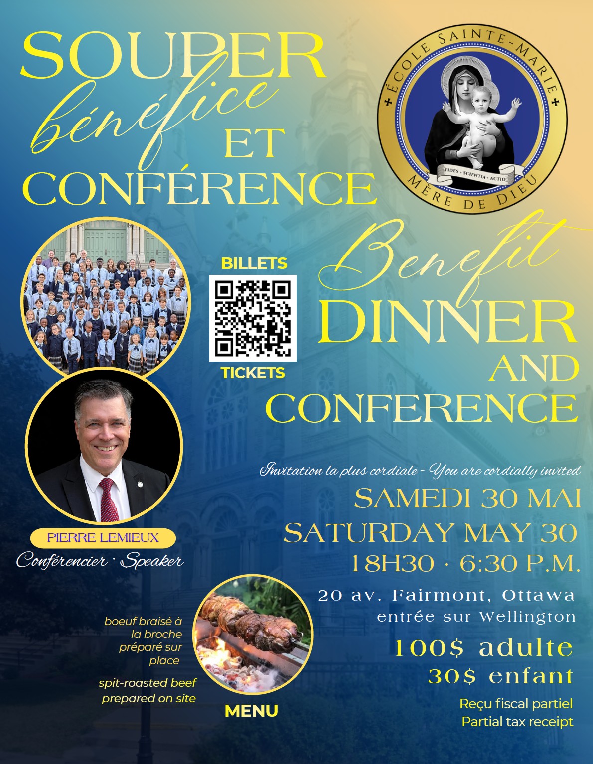 Des billets individuels ainsi que des tables sont disponibles. Un reçu fiscal partiel sera émis.