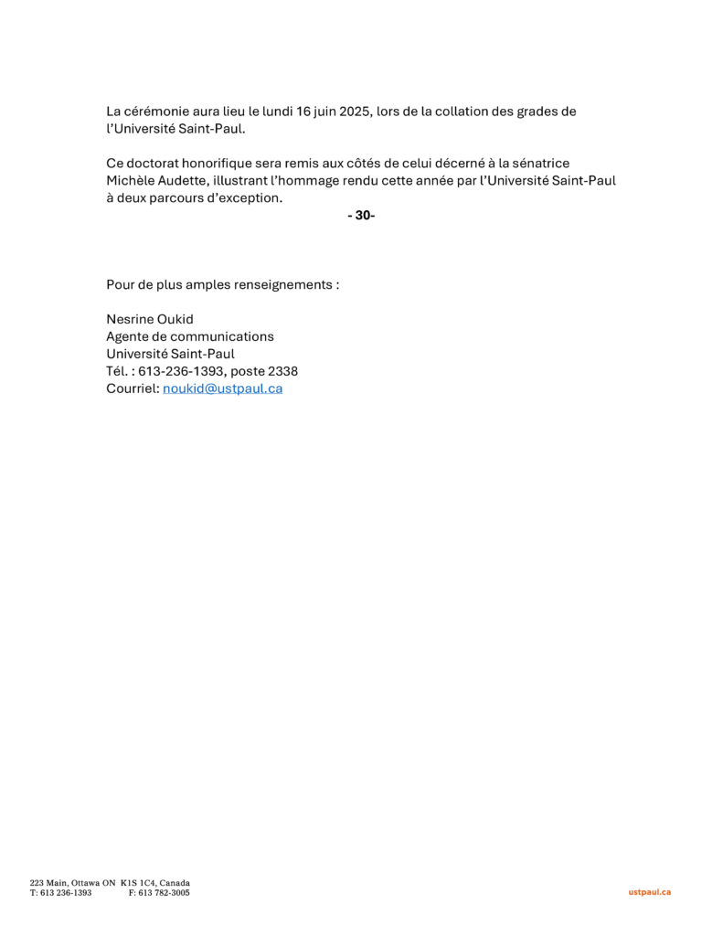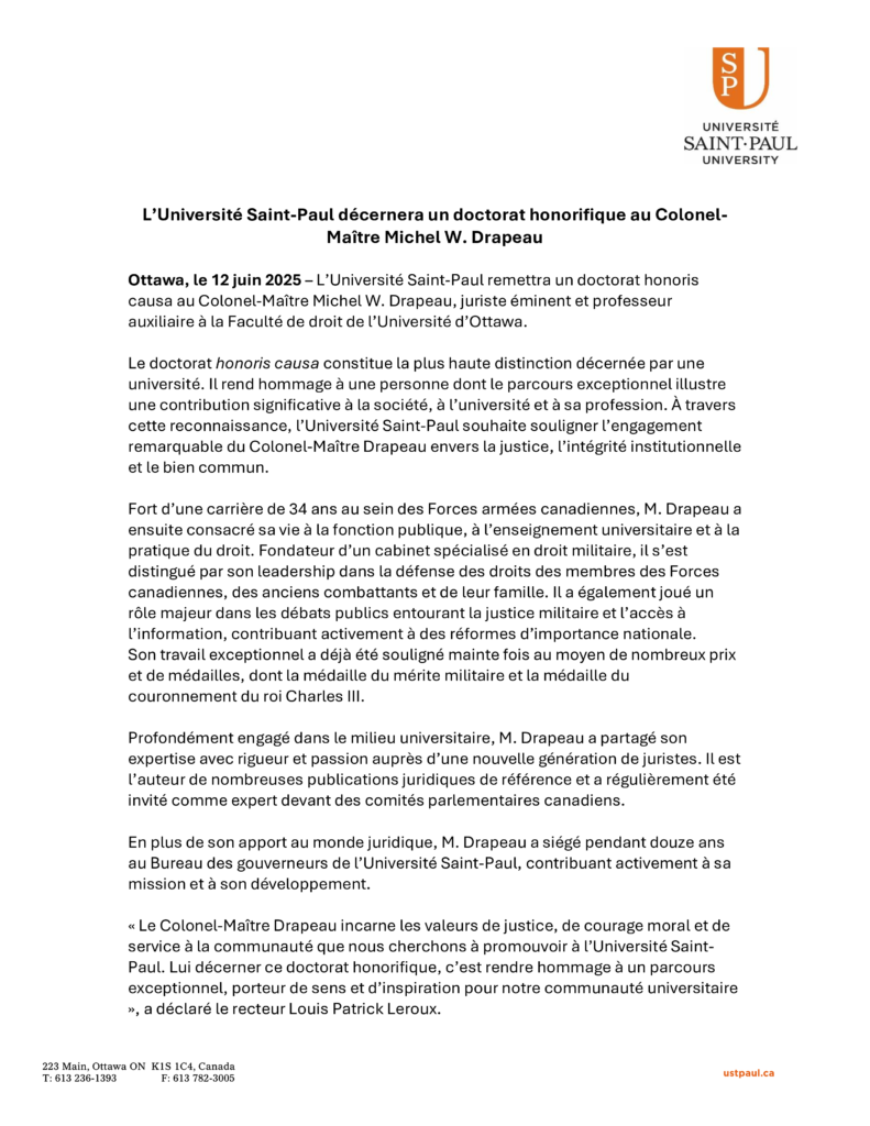 Le 16 juin 2025, lors de sa cérémonie annuelle de remise de diplômes, l’Université Saint-Paul honorera une personnalité d’exception: le Colonel – Maître Michel W. Drapeau en lui décernant un doctorat honorifique.