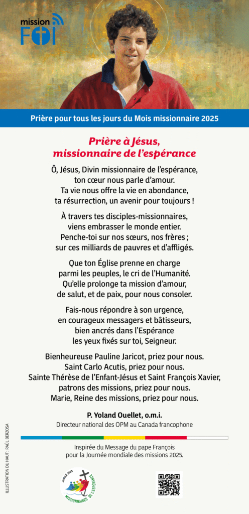 Le Mois missionnaire d’octobre est une occasion pour l’Église de souligner l’importance de l’engagement missionnaire de la part de tous les baptisés, ainsi que les diverses initiatives d’évangélisation qui y sont rattachées. La Journée mondiale des missions (JMM) – instaurée par le pape Pie XI en 1926 et confiée à l’Œuvre pontificale de la propagation de la foi – constitue le point culminent du Mois. Célébrée chaque avant-dernier dimanche d’octobre, c’est une journée spéciale de prière et de collecte de fonds pour venir en aide aux diverses initiatives soutenues par l’Œuvre pontificale de la propagation de la foi partout dans le monde.